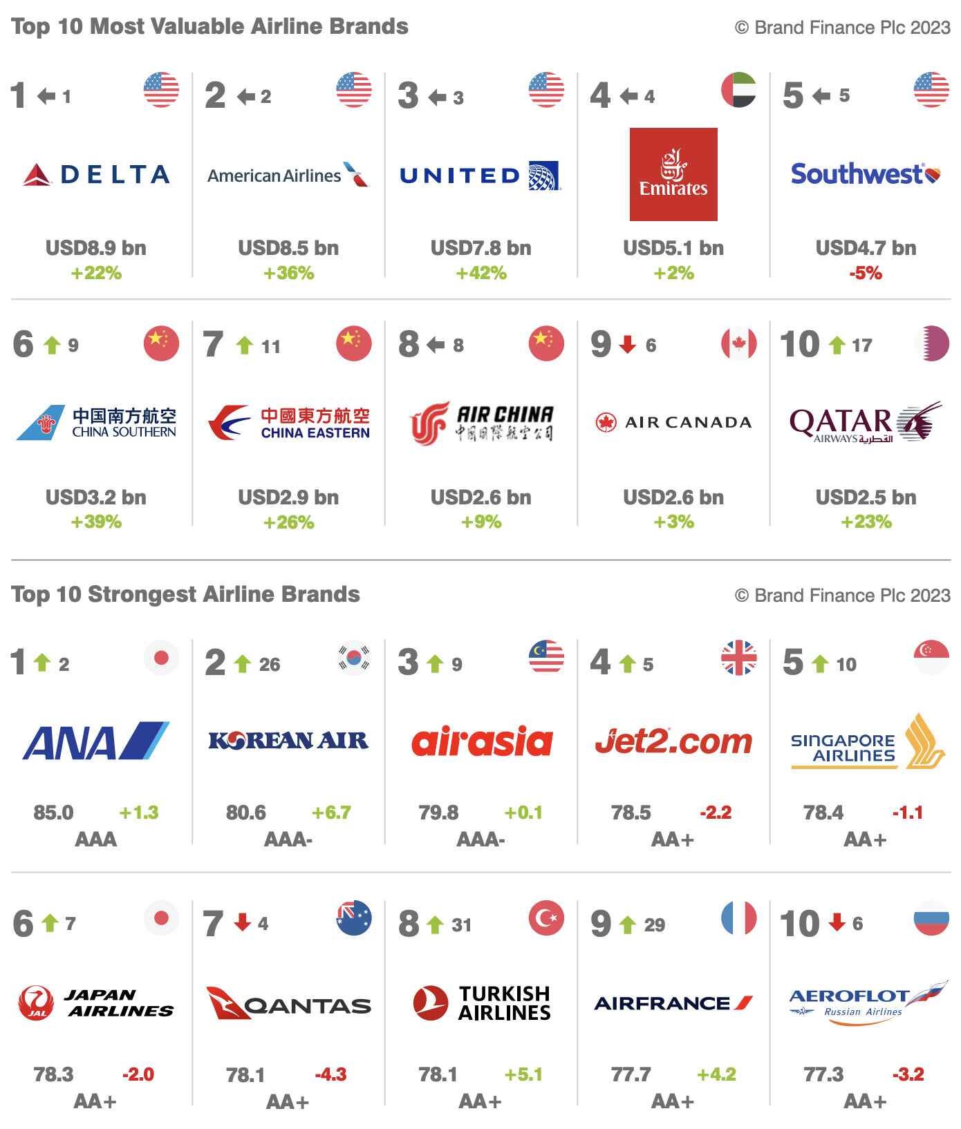 ✈️ Cinci poziții dintre cele mai puternice 10 branduri de companii aeriene din lume sunt ocupate de companii aeriene asiatice. Însă, topul celor mai valoroase branduri de companii aeriene este dominat de americani. Pe larg aici.
