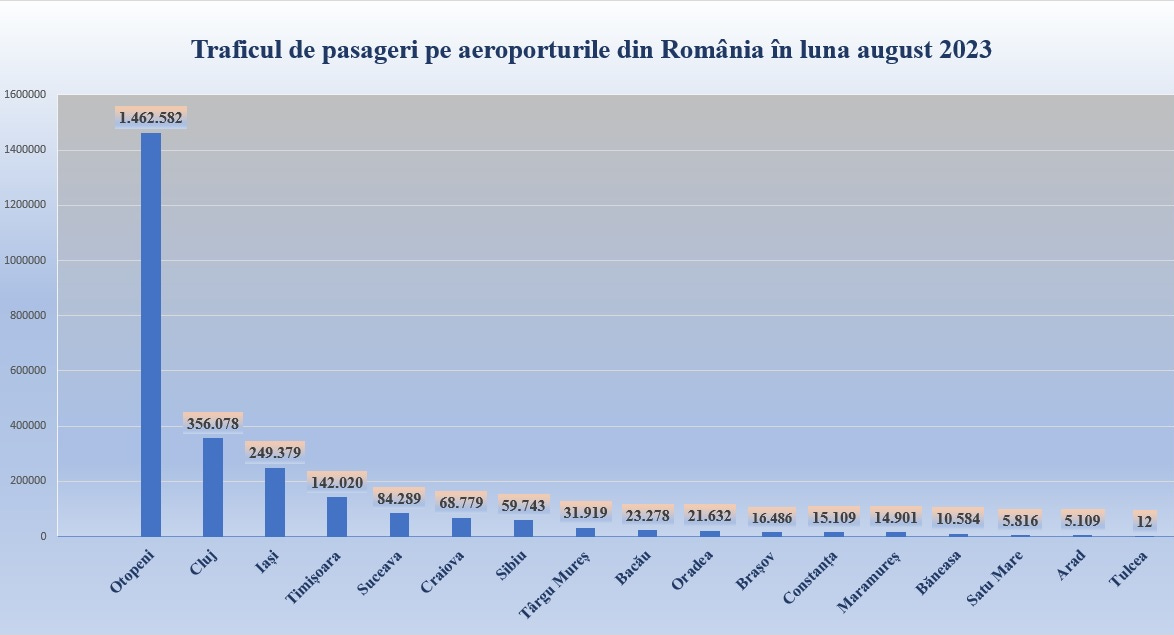 📰 PE SCURT: Traficul aerian pe aeroporturile din România a păstrat trendul ascendent și în luna august 2023. Aproape 2,6 milioane de pasageri au tranzitat cele 17 aeroporturi românești, cu 5,8 procente mai mulți decât în aceeași perioadă a anului 2019 și cu 5% mai mulți decât în luna august 2022.